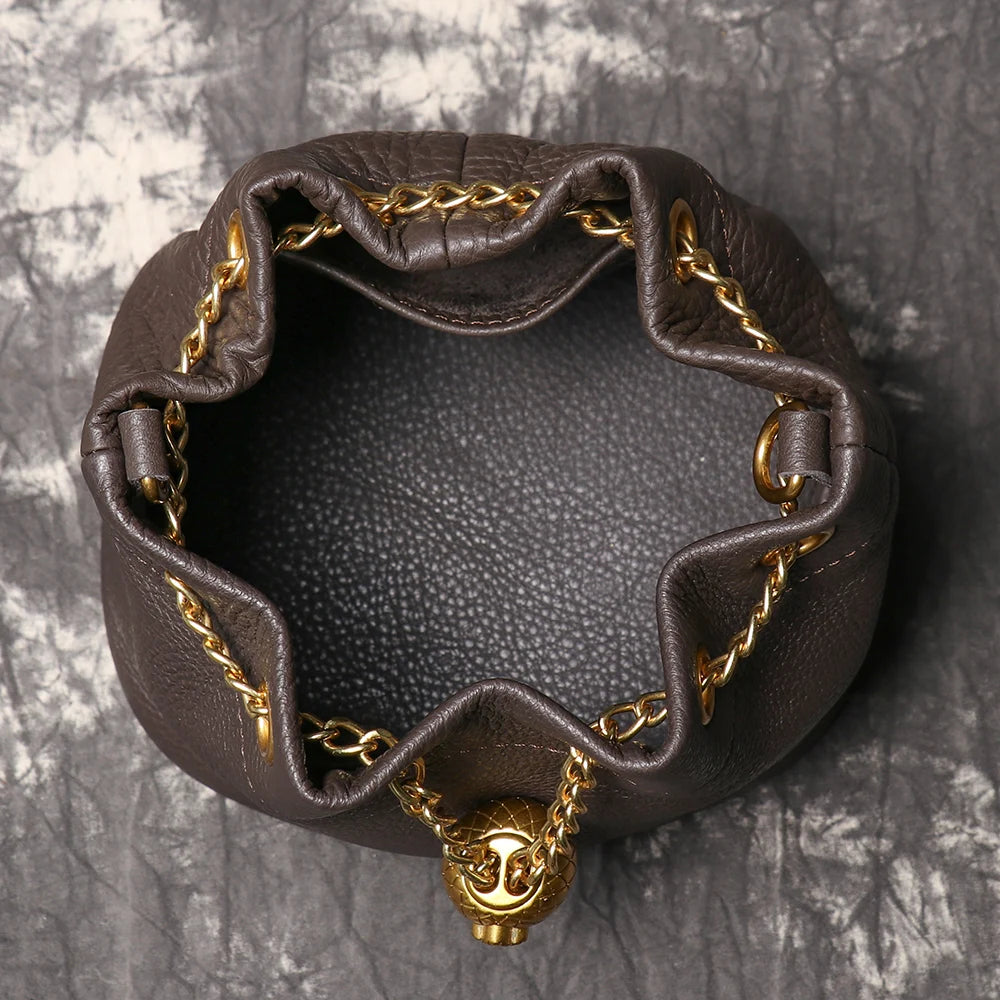 LUOKIR New Metal Drawstring Versatile Women's Handbag Genuine Leather Chain Crossbody Bag Vintage Bucket Bag Mobile Phone Bag