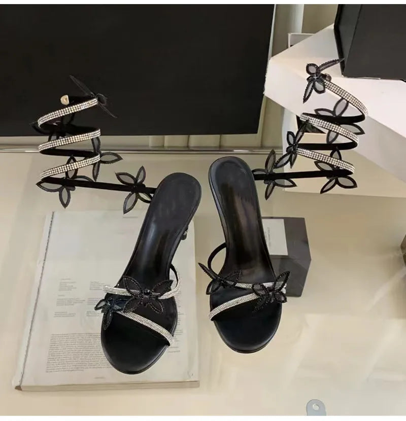 Luxury Crystal Embellished Butterfly Detail Women Sandals Sexy Coiled Strap Thin High heels Gladiator sandals Summer Party Shoes