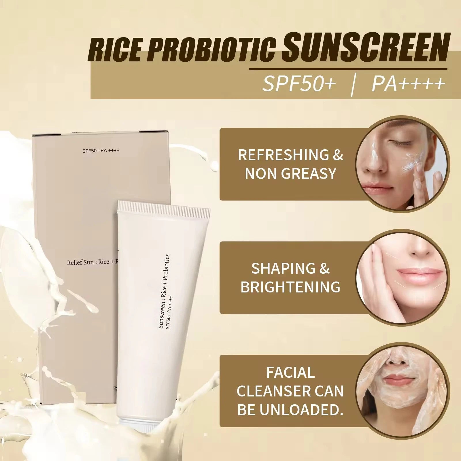 SPF50+ Sunscreen Korean Rice Probiotic Solar Blocker Skin Whitening Cream Anti UV Sun Block Facial Mild Moisturizer Serum 50ml