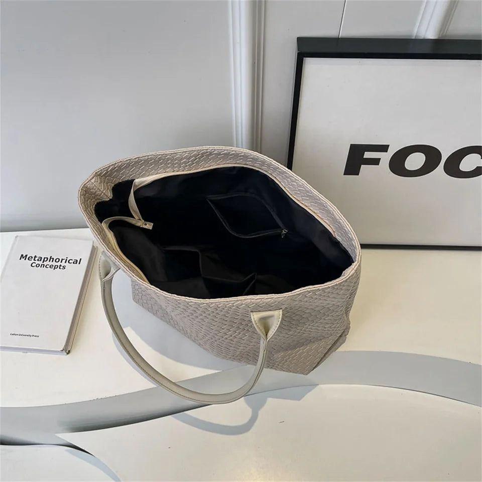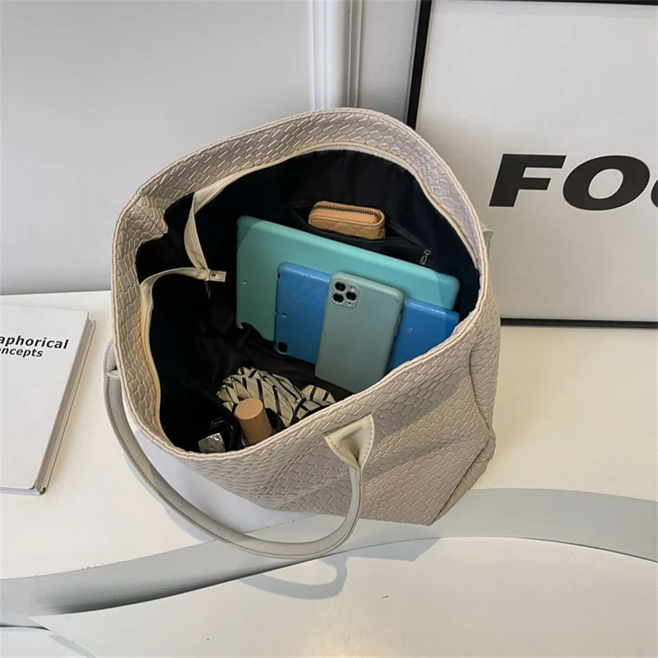 Women's Woven Pattern Tote Bag Elegant PU Leather Handbag Vintage Large Capacity Fashion Trending Japon Style Shoulder Bags